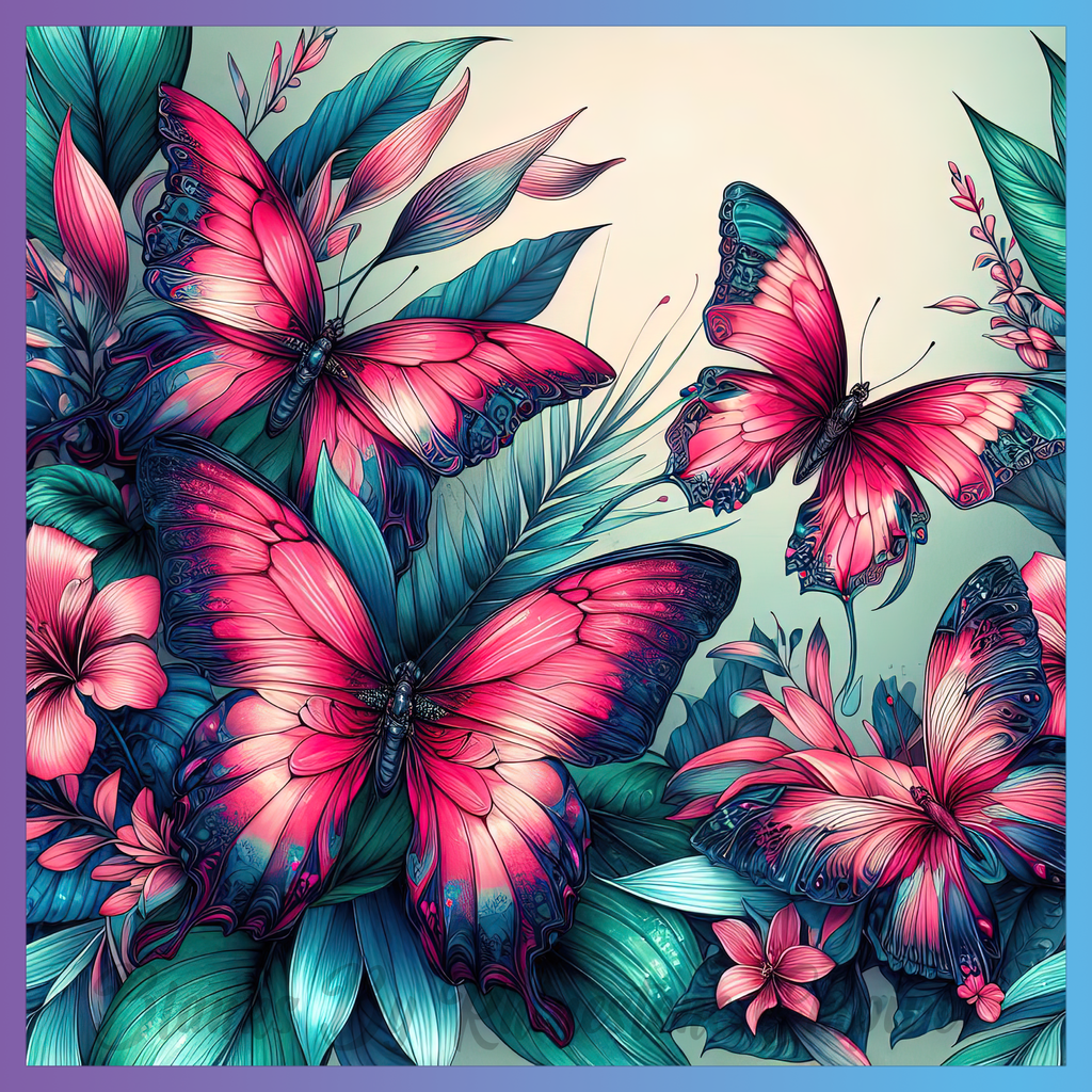 Theme: Butterfly with colorful, flowers, leaves, tropical.