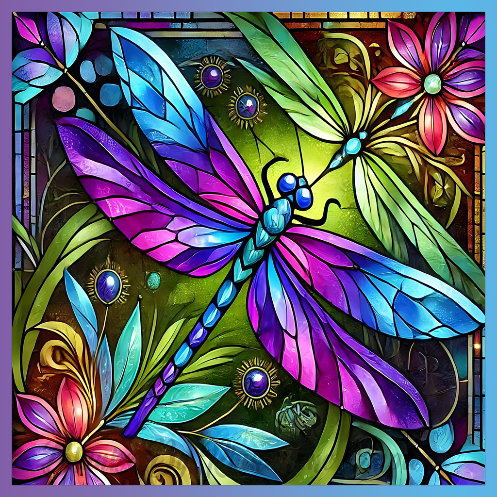 Theme: Dragonfly with stained glass, colorful, flowers, leaves.