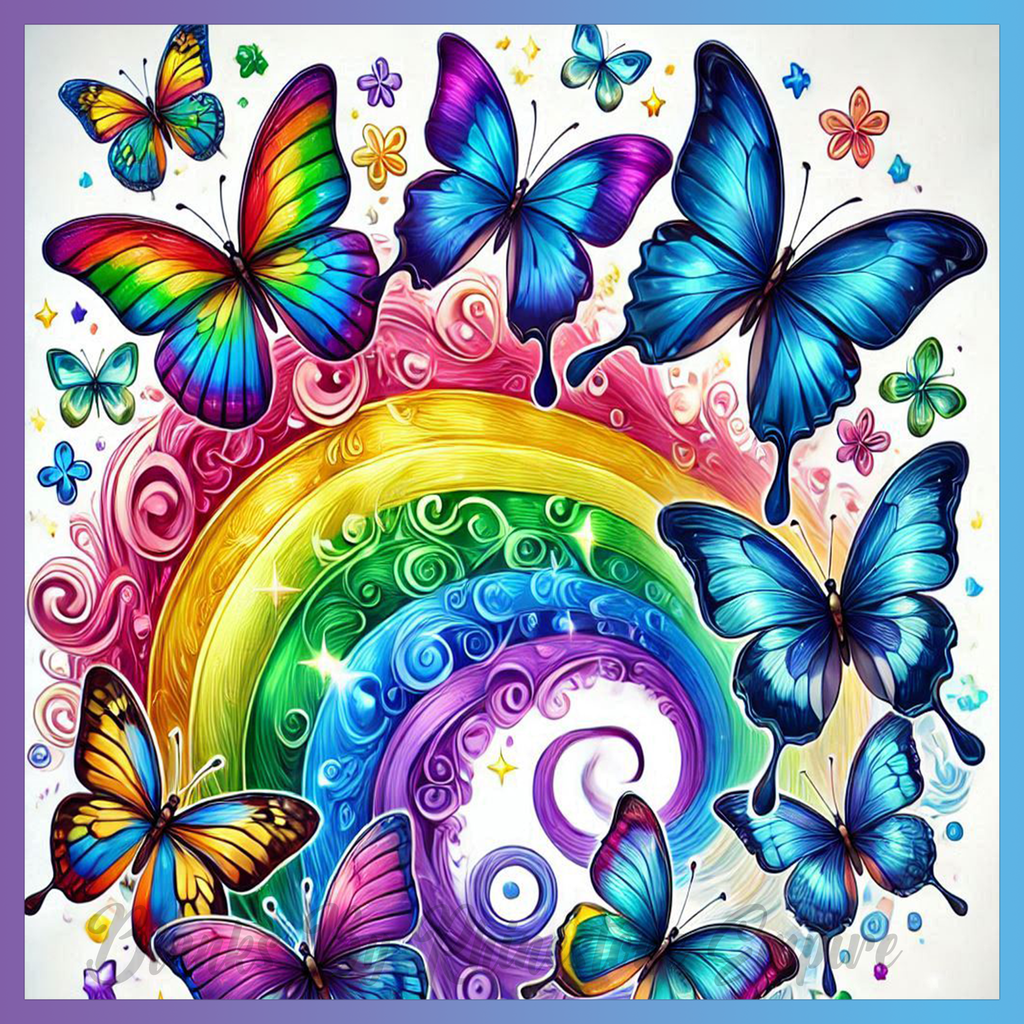 Theme: Butterfly with colorful, rainbow, swirls, flowers.