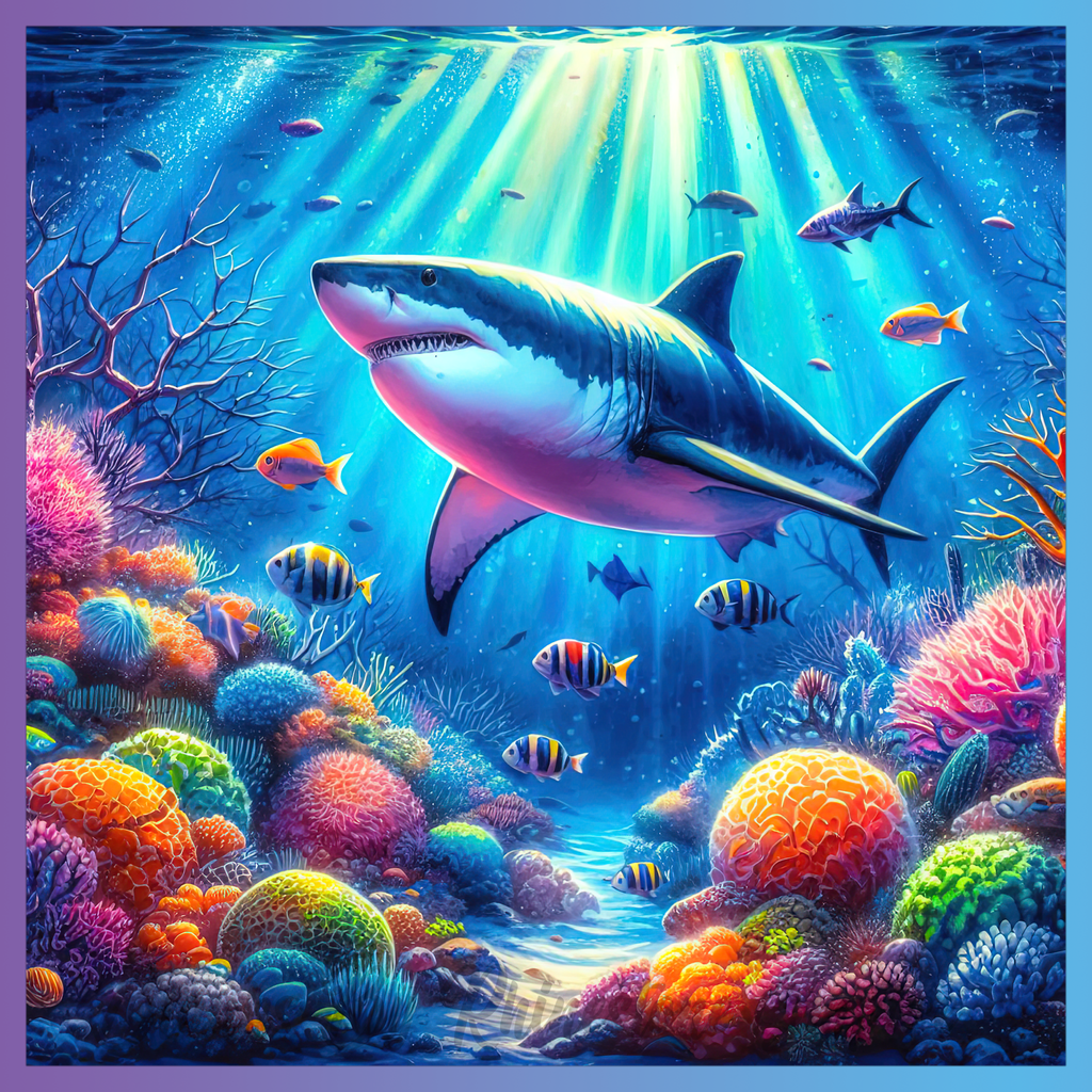 Theme: Shark with coral, ocean, colorful, light rays.