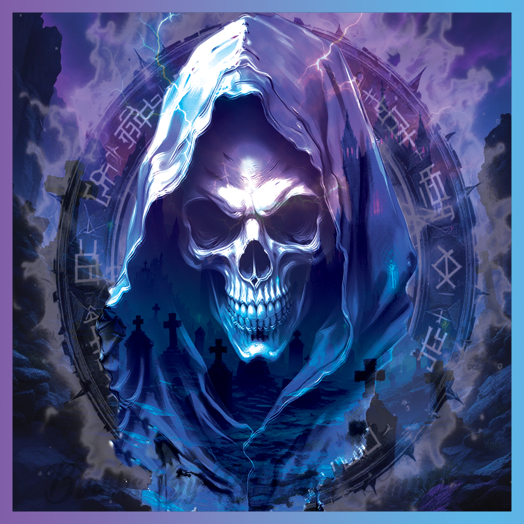 Theme: Skull with hooded, dark, mystical, lightning.