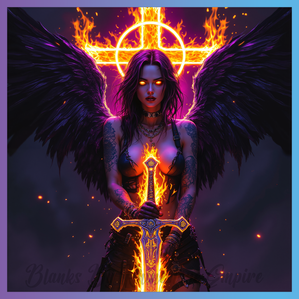 Theme: Angel with fire, sword, wings, tattoos.