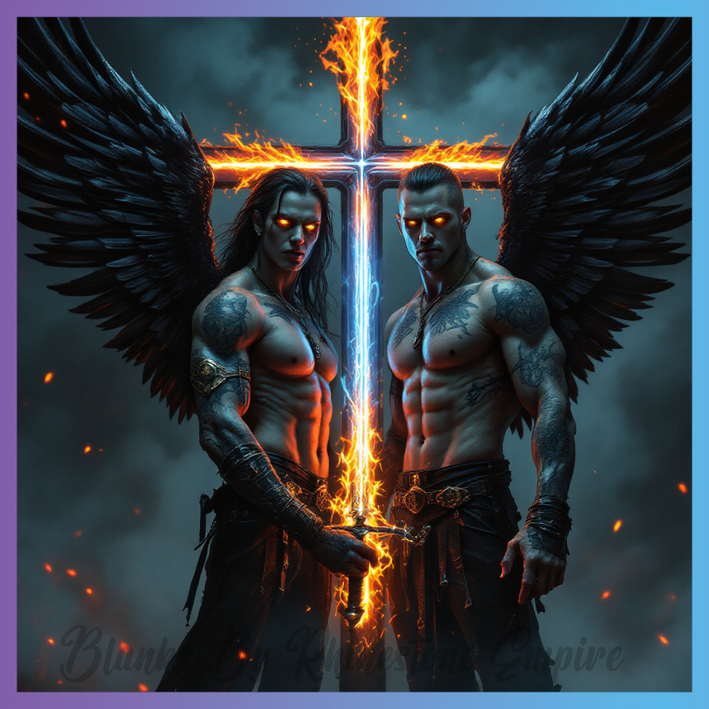 Theme: Angel with wings, sword, cross, fire.
