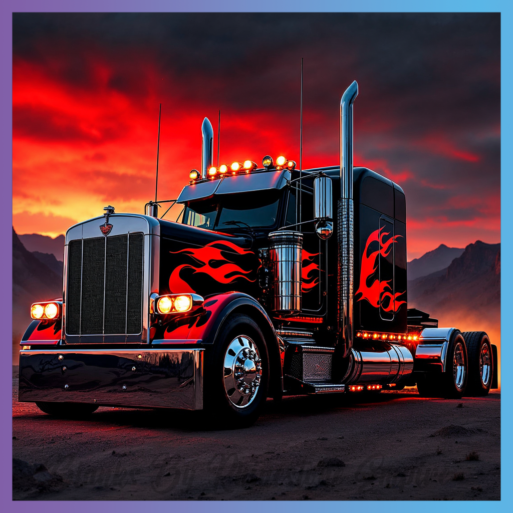 Theme: Truck with black, flames, sunset, mountains.