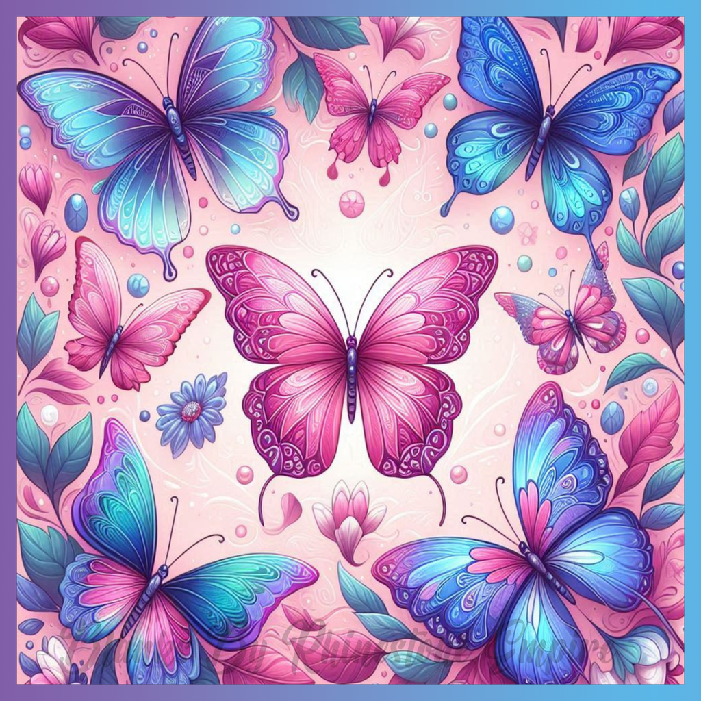 Theme: Butterfly with colorful, pink, blue, flowers.