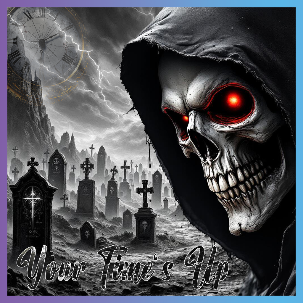Theme: Skull with graveyard, hooded, dark, crosses.