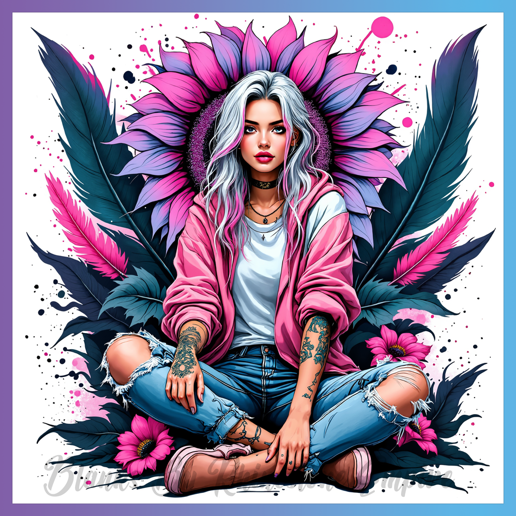 Theme: Girl with tattoo, sunflower, pink, leaves.