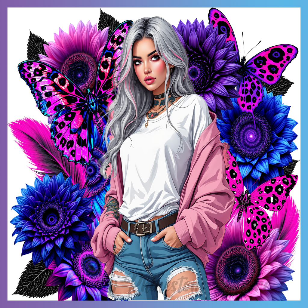 Theme: Girl with tattoo, flowers, butterflies, colorful.