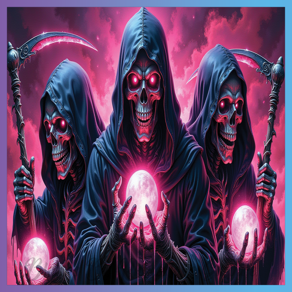 Theme: Skull with grim reaper, hooded, glowing eyes, sickle.