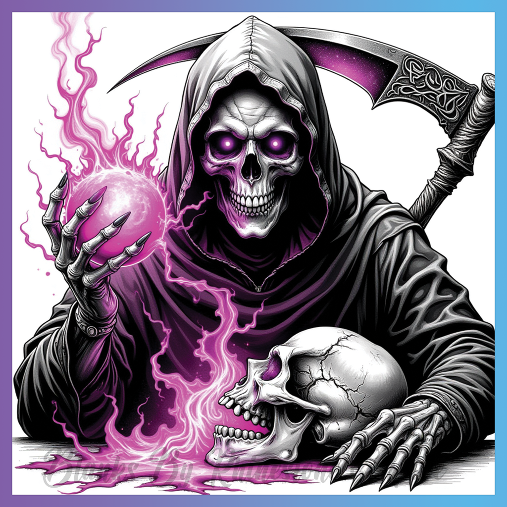 Theme: Skull with grim reaper, magic, purple, scythe.