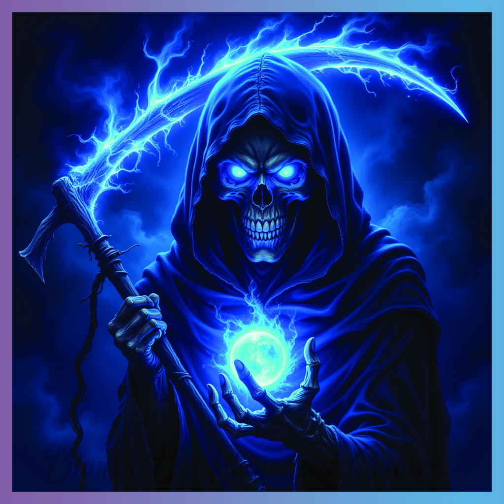 Theme: Reaper with scythe, blue, lightning, hooded.