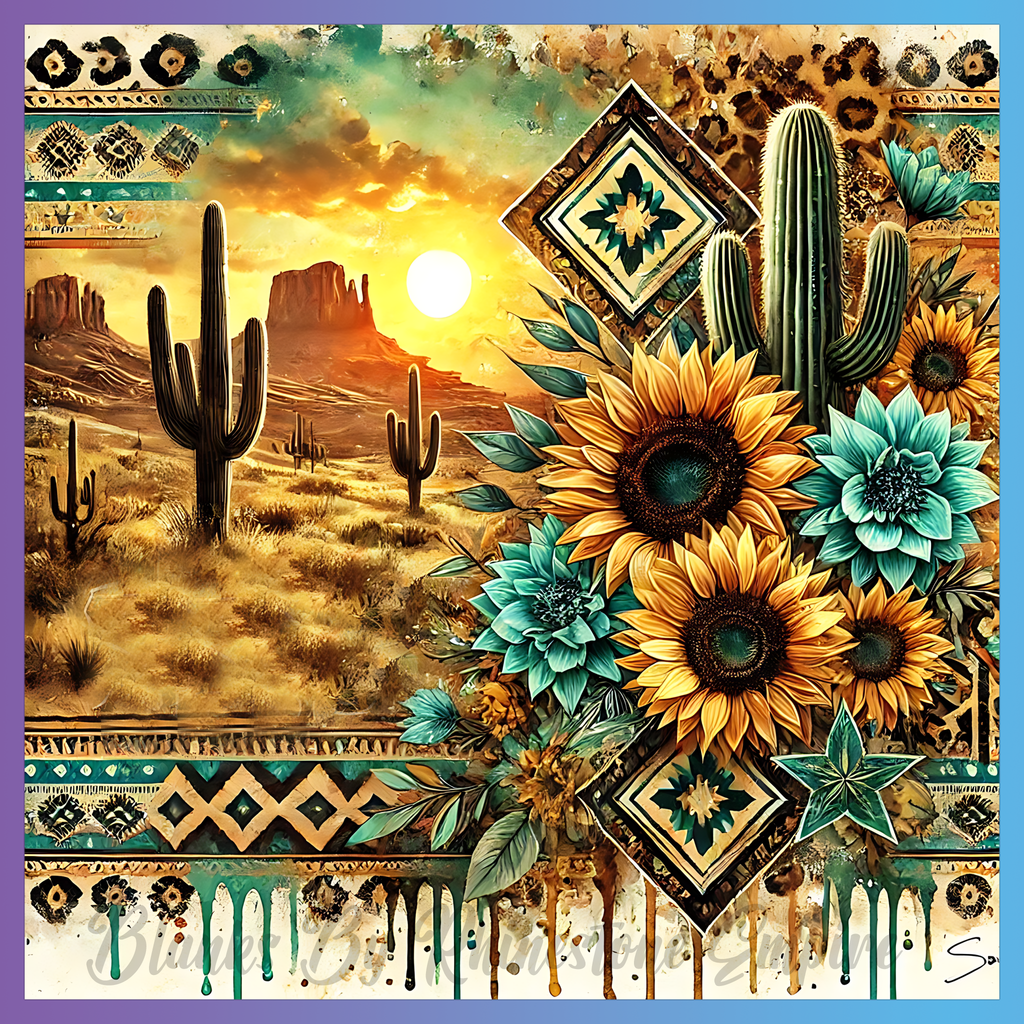 Theme: Sunflower with cactus, desert, sunset, landscape.