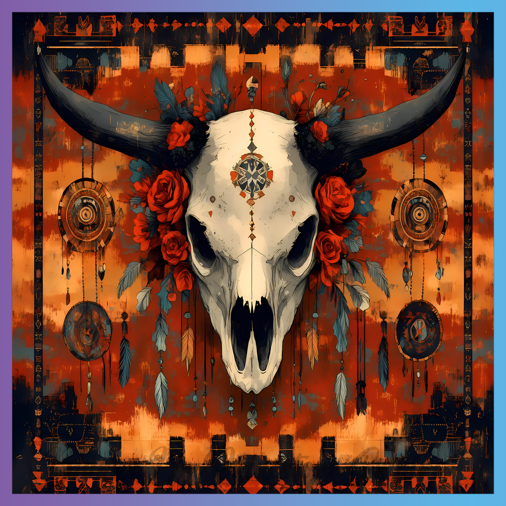 Theme: Skull with bull, flowers, feathers, ornamental.