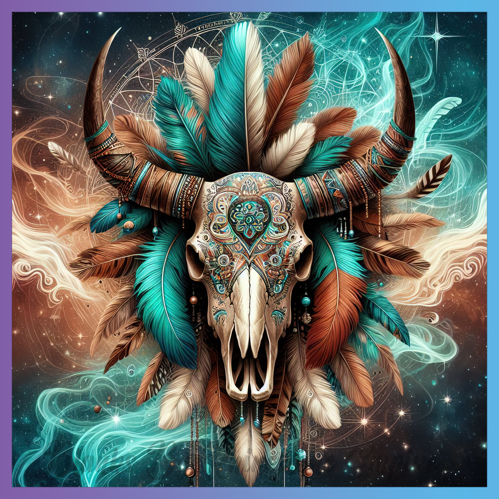 Theme: Skull with feathers, ornate, colorful, abstract.