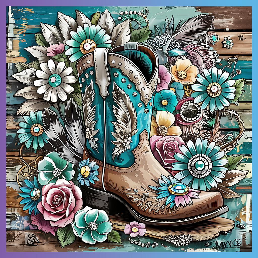 Theme: Boot with flowers, feathers, colorful, wood.