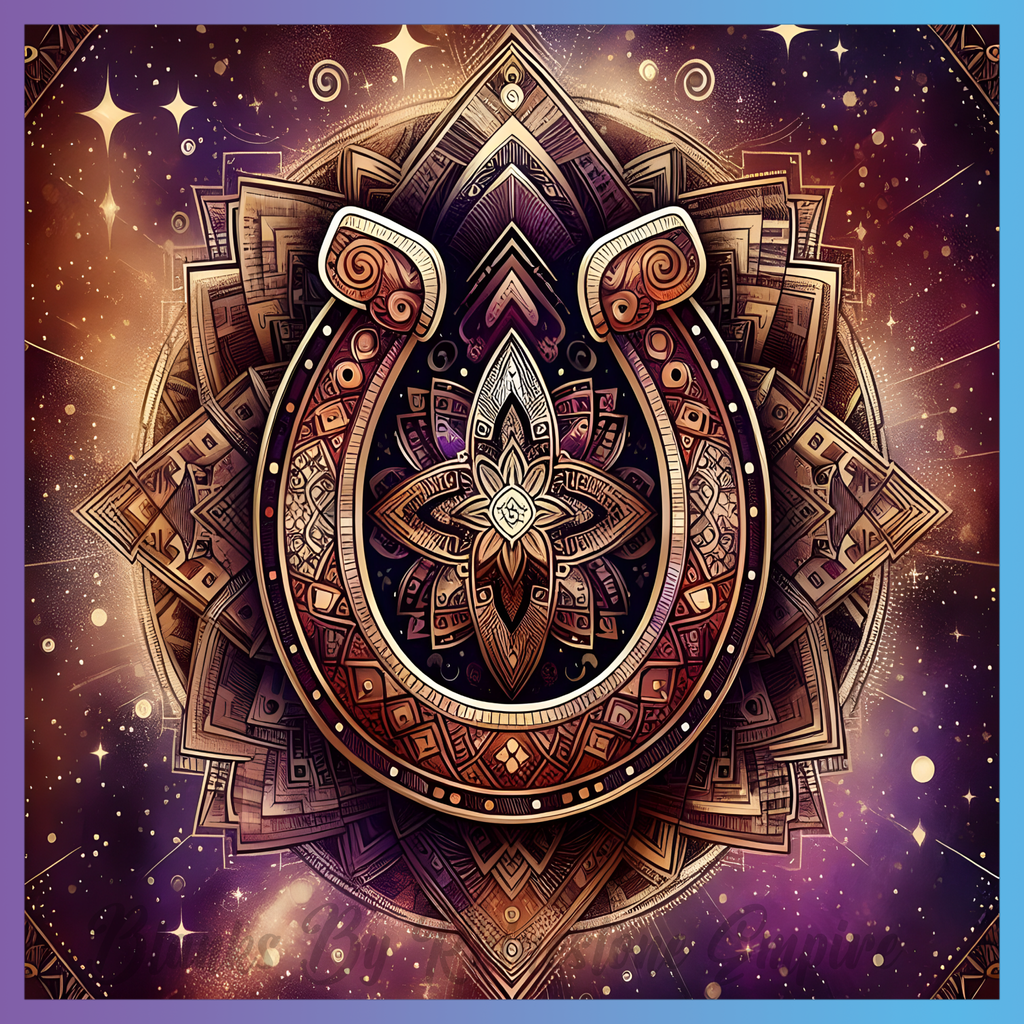 Theme: Horseshoe with mandala, geometric, ornate, cosmic.