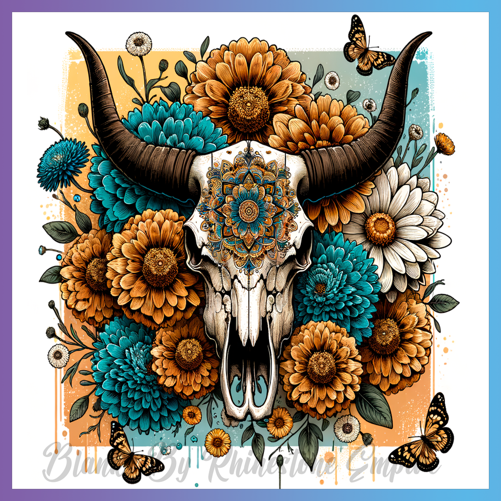 Theme: Skull with flowers, butterflies, colorful, ornate.