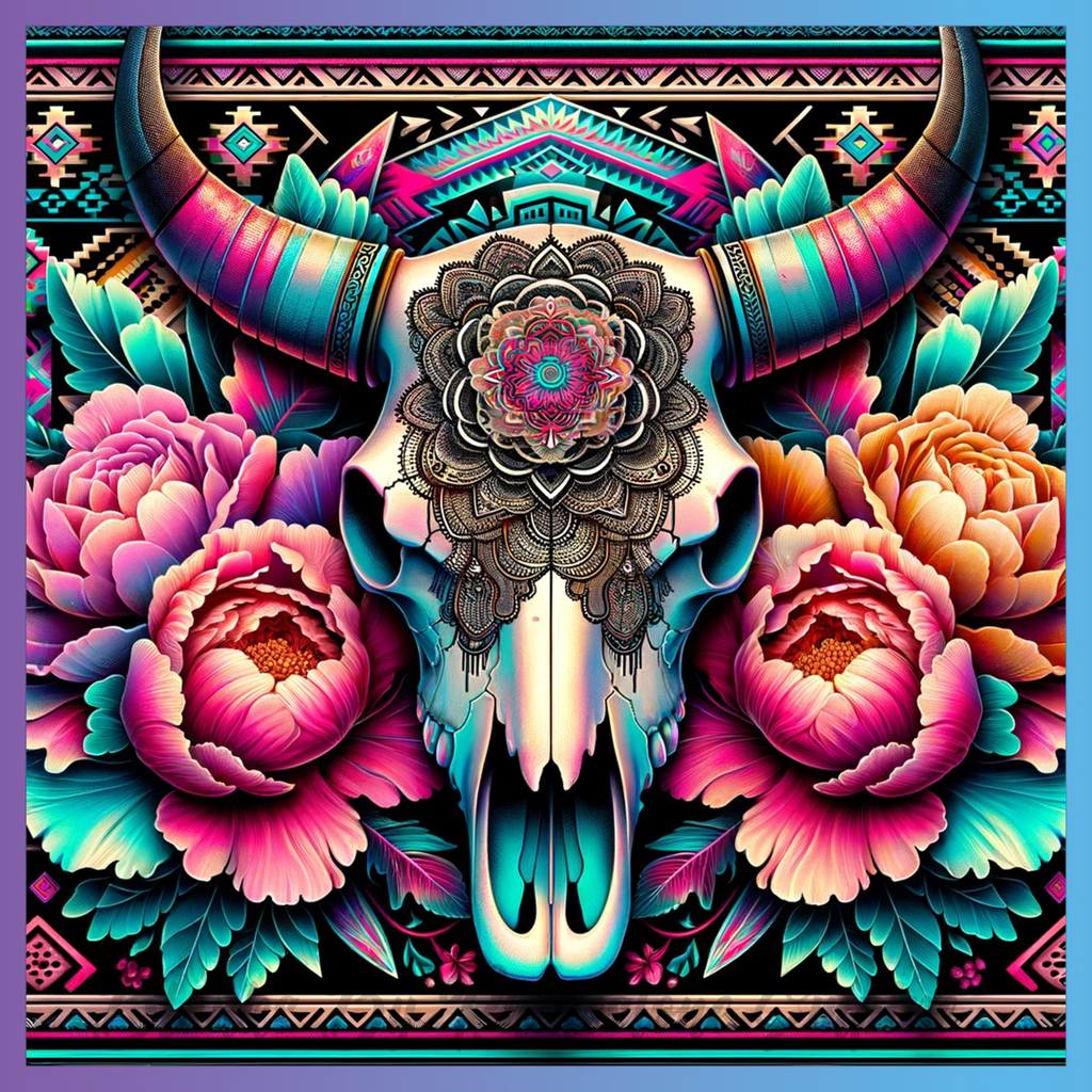 Theme: Skull with flowers, colorful, mandala, bohemian.