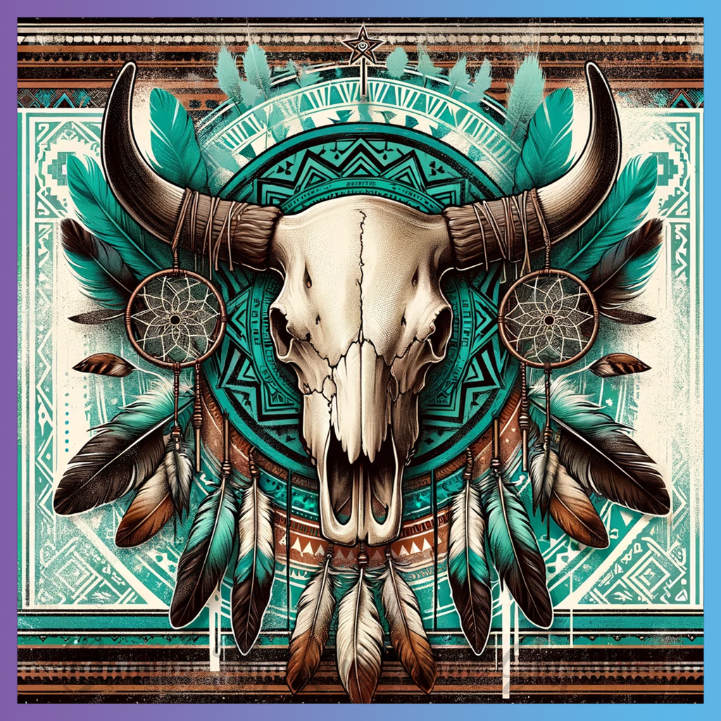 Theme: Skull with horns, feathers, dreamcatchers, tribal.