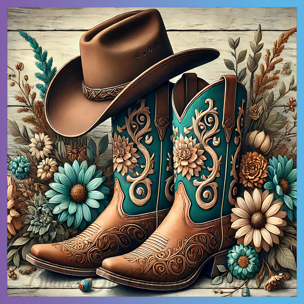Theme: Boots with cowboy, hat, flowers, ornate.