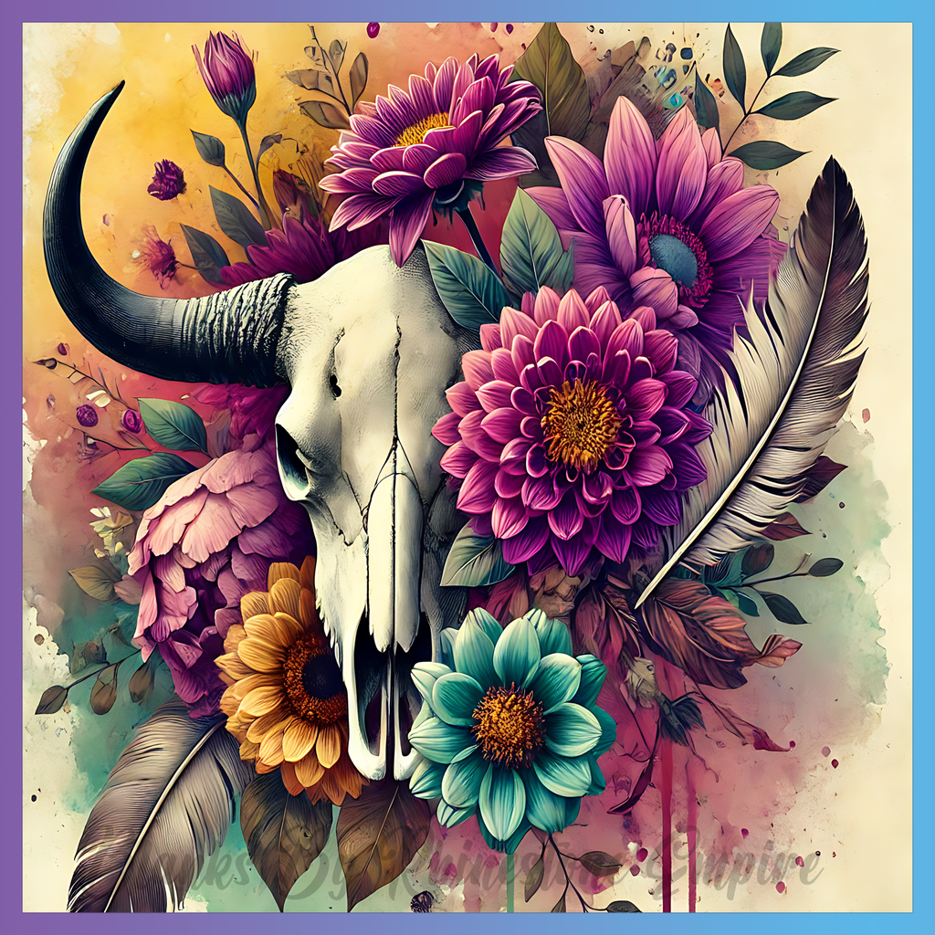 Theme: Skull with flowers, feathers, colorful, nature.
