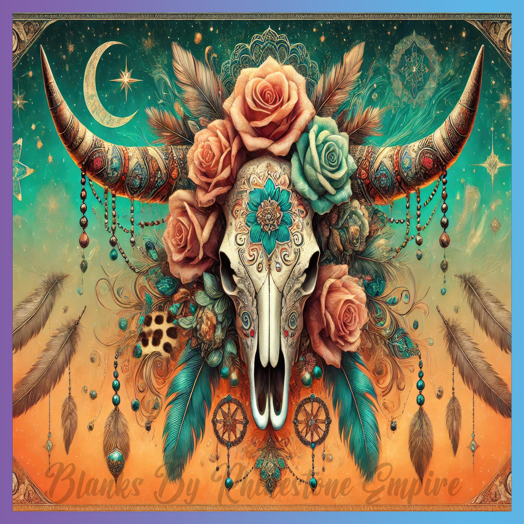 Theme: Skull with roses, feathers, moon, dreamcatchers.