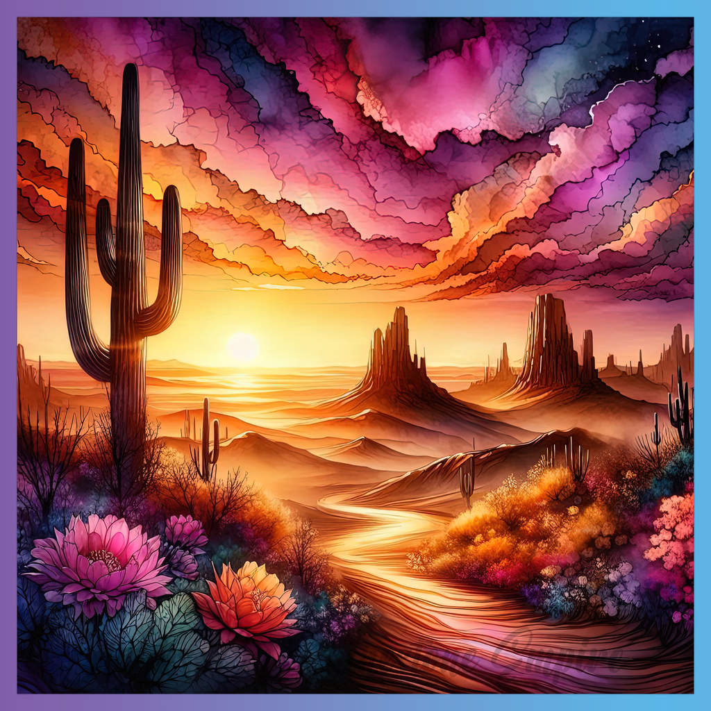 Theme: Desert with sunset, cacti, mountains, flowers.