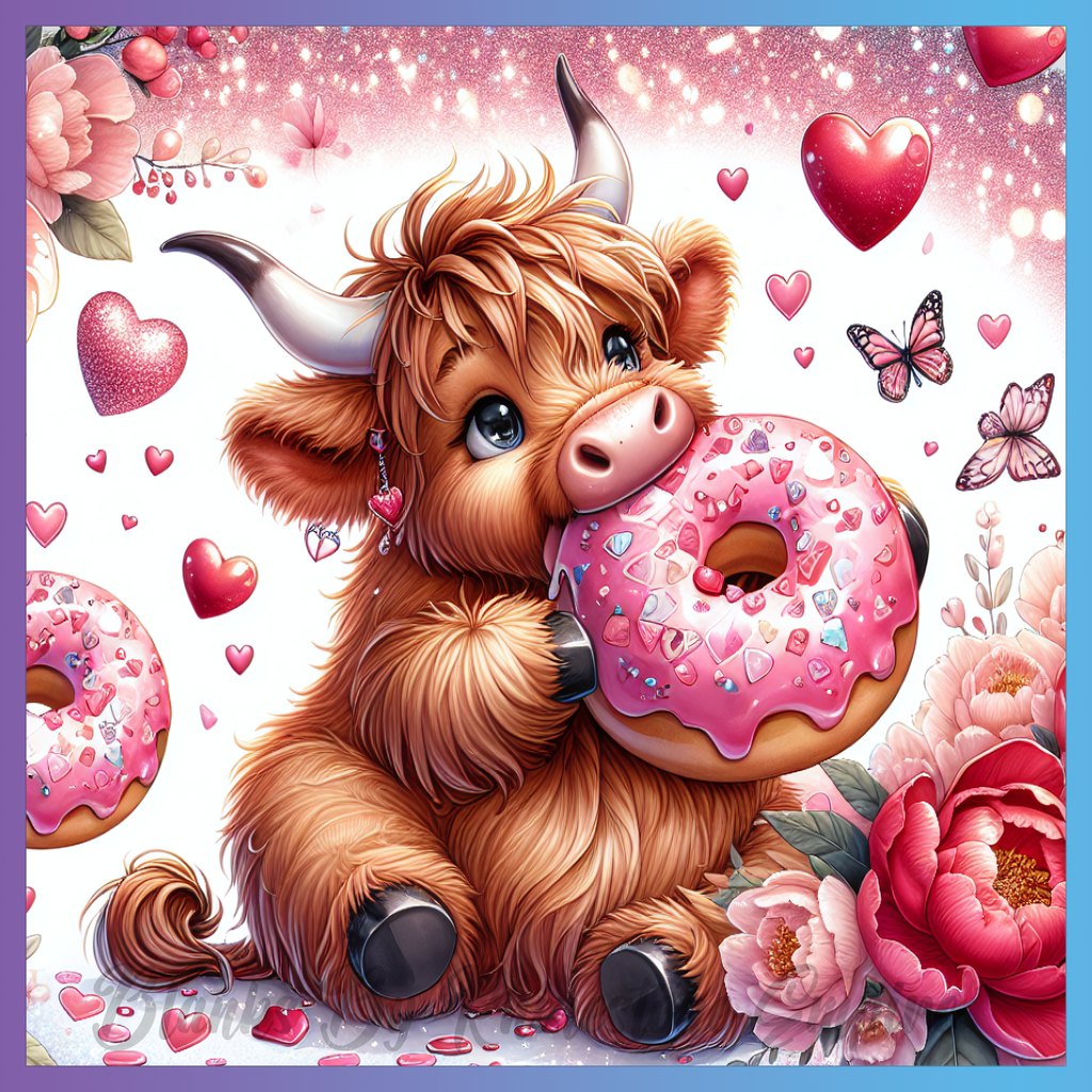 Theme: Cow with donut, hearts, butterflies, flowers.