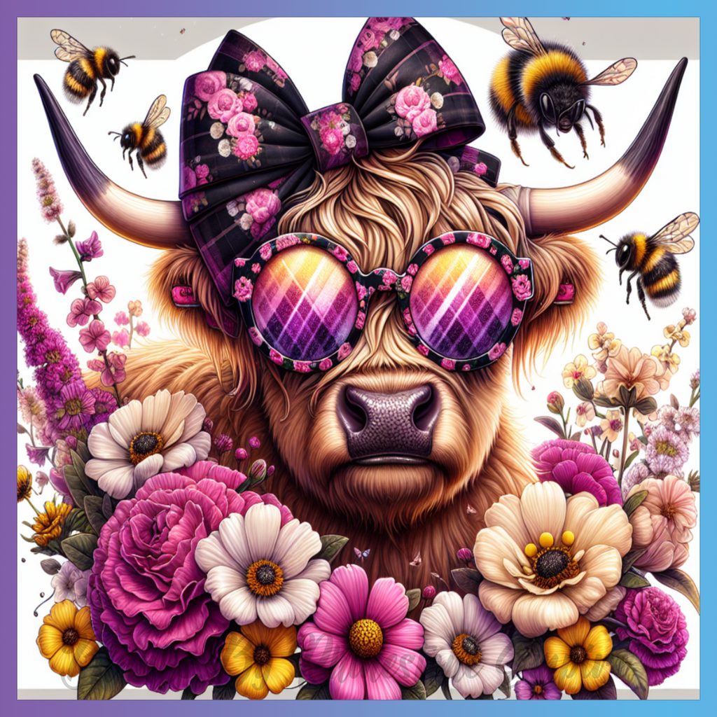 Theme: Cow with flowers, glasses, bow, bees.