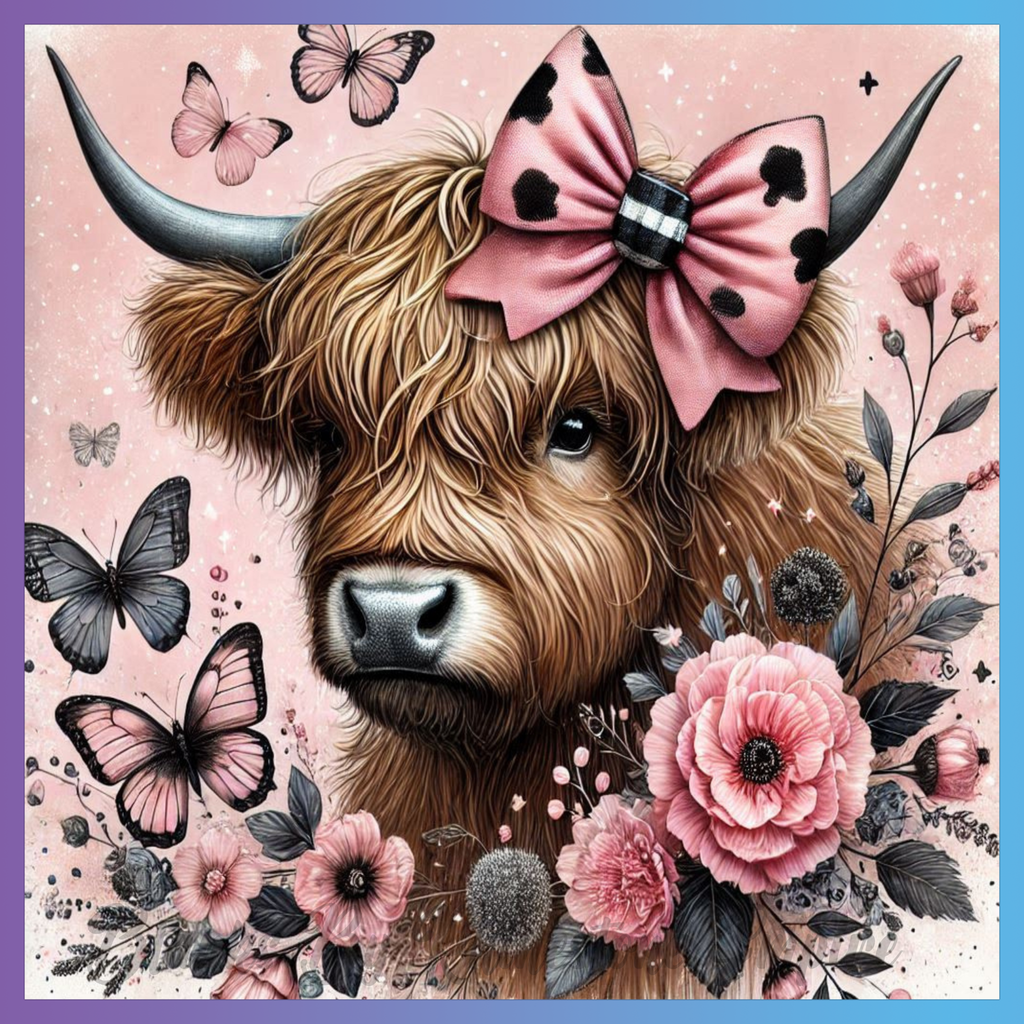 Theme: Cow with bow, flowers, butterflies, pink.
