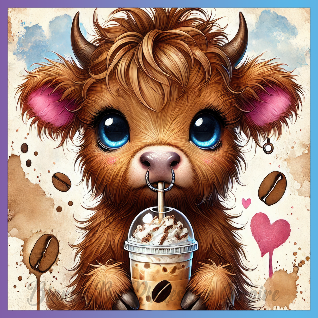Theme: Cow with cute, beverage, coffee, cartoon.