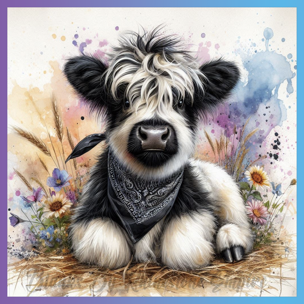 Theme: Cow with bandana, flowers, grass, watercolor.