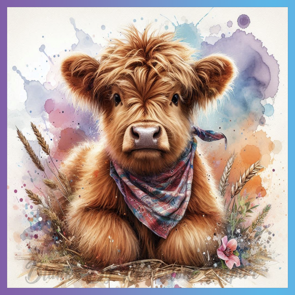 Theme: Cow with cute, bandana, grass, flowers.