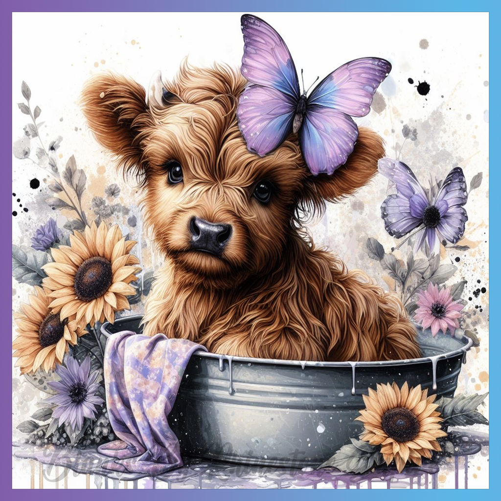 Theme: Calf with butterflies, sunflowers, flowers, bucket.