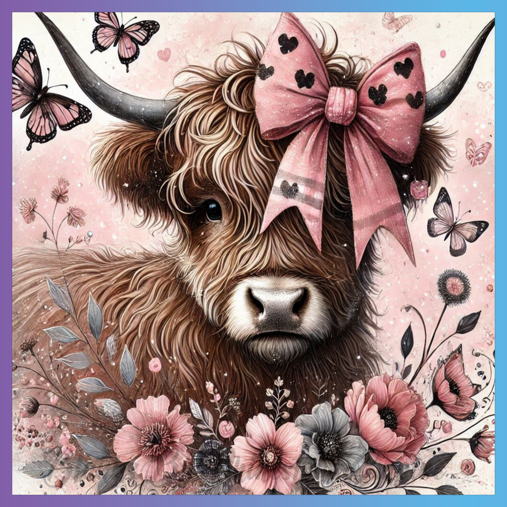 Theme: Cow with butterflies, bow, flowers, pink.