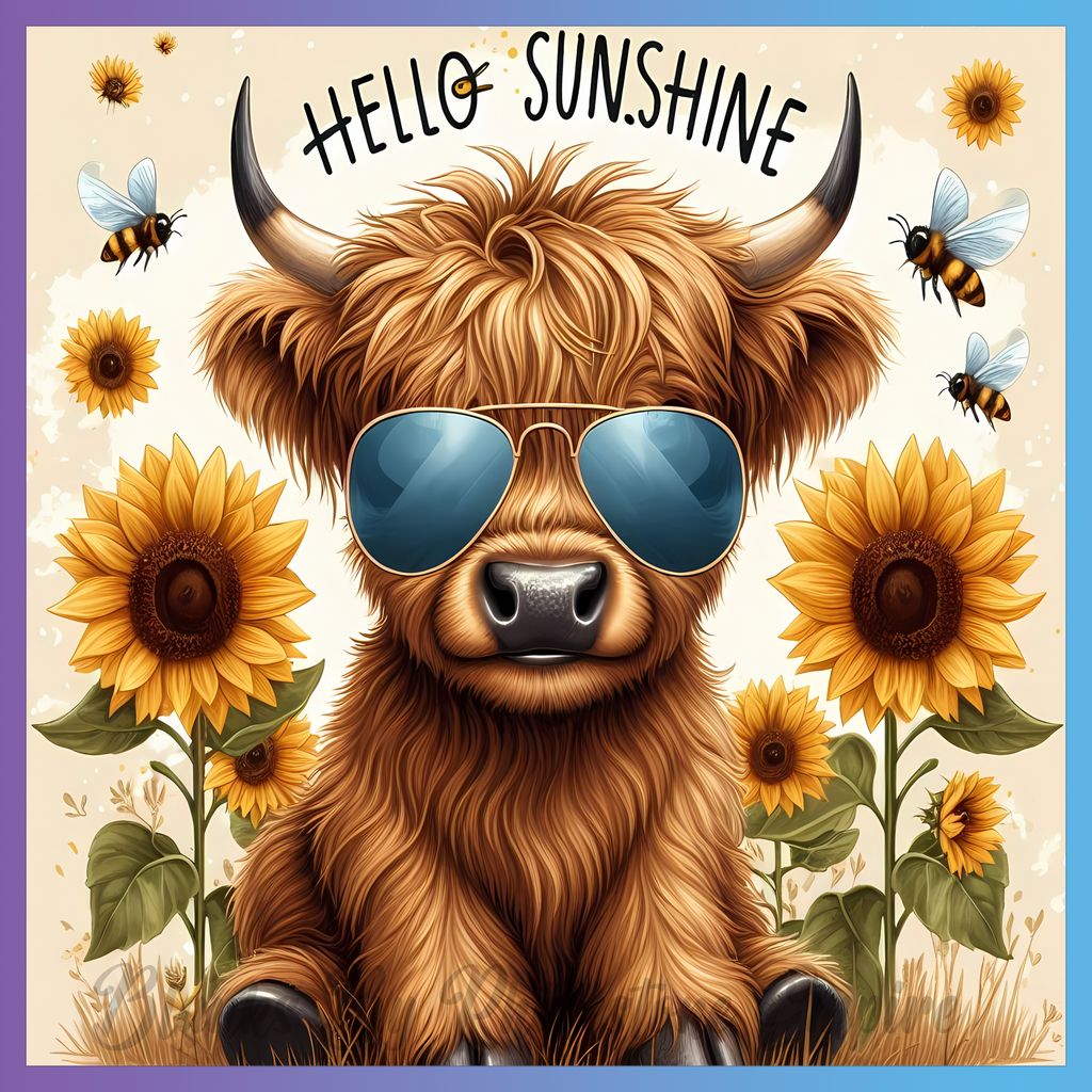 Theme: Cow with sunglasses, sunflowers, bees, cartoon.