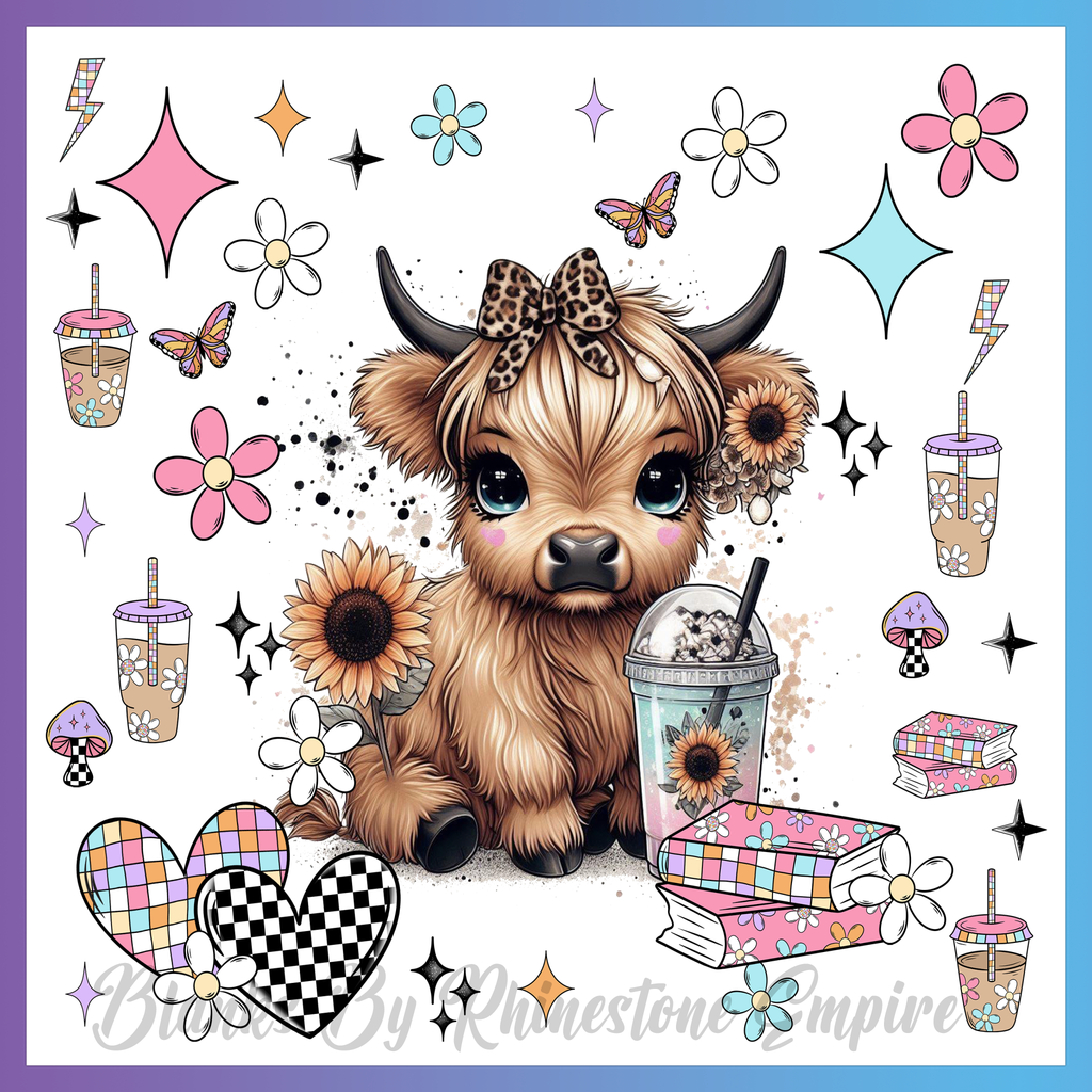 Theme: Cow with cute, flowers, drinks, butterflies.