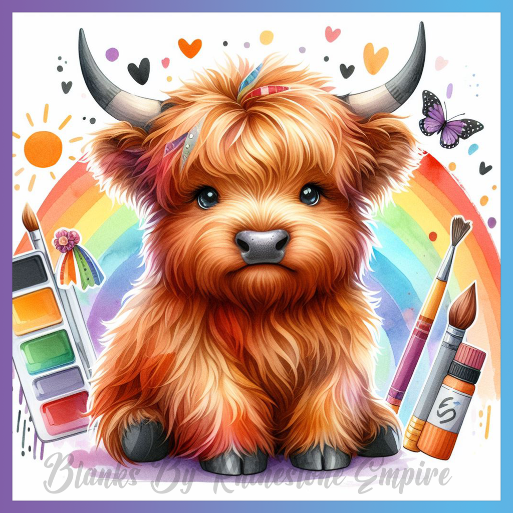Theme: Highland with cow, colorful, rainbow, butterfly.
