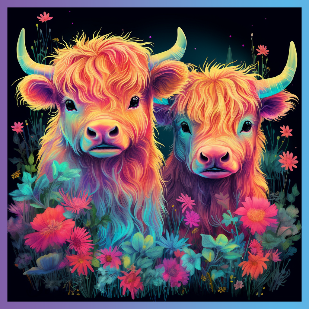 Theme: Cows with colorful, flowers, vibrant, nature.