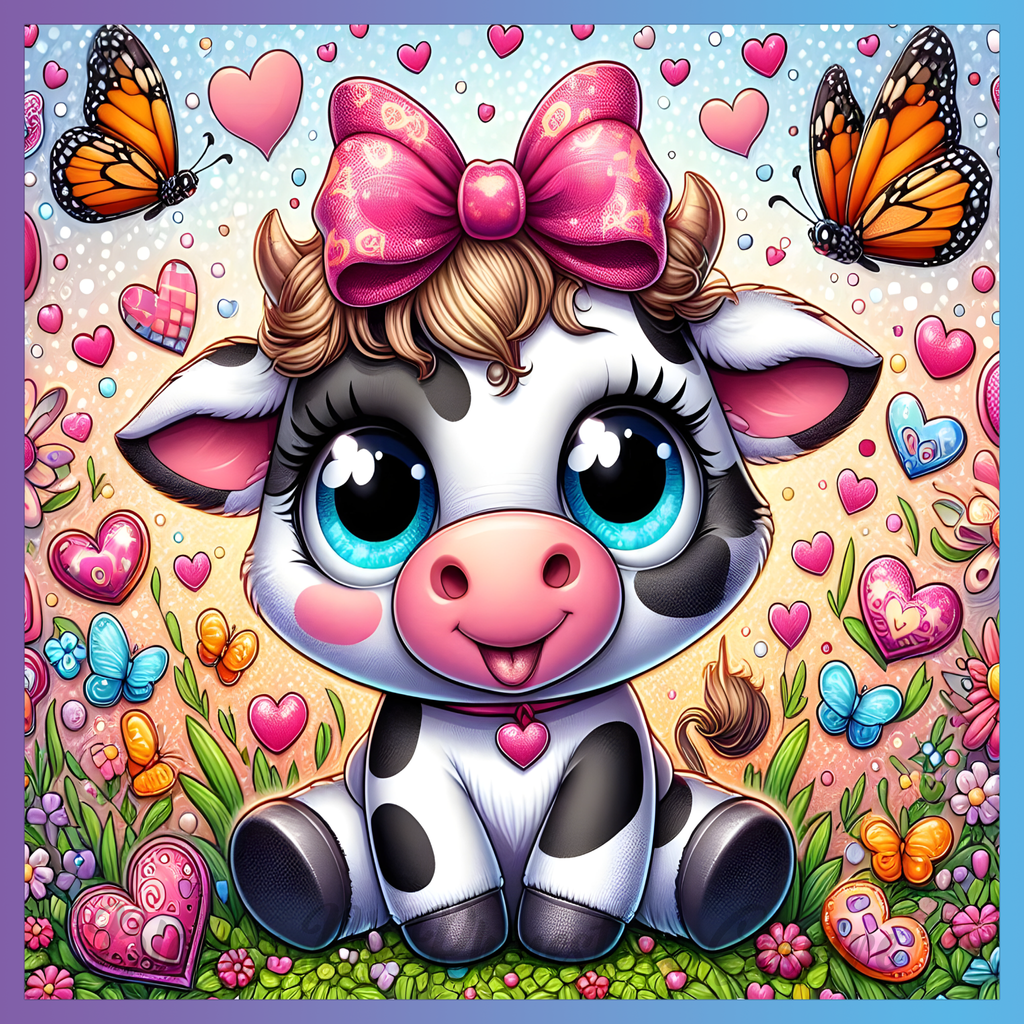 Theme: Cow with cute, cartoon, butterflies, hearts.