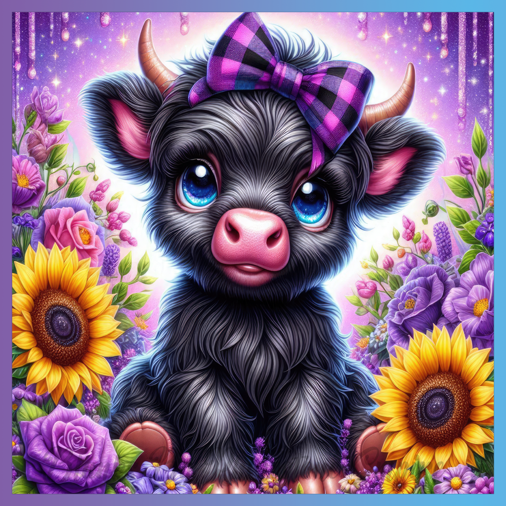 Theme: Calf with flowers, sunflowers, purple, cute.