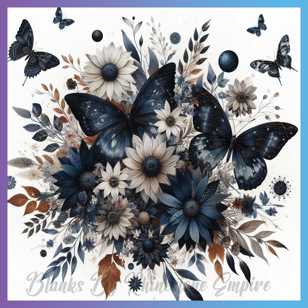 Theme: Butterfly with flowers, blue, ornamental, nature.
