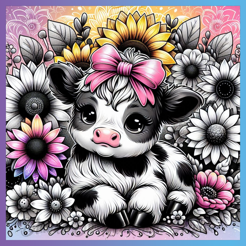 Theme: Cow with flowers, sunflowers, pink bow, cartoon.