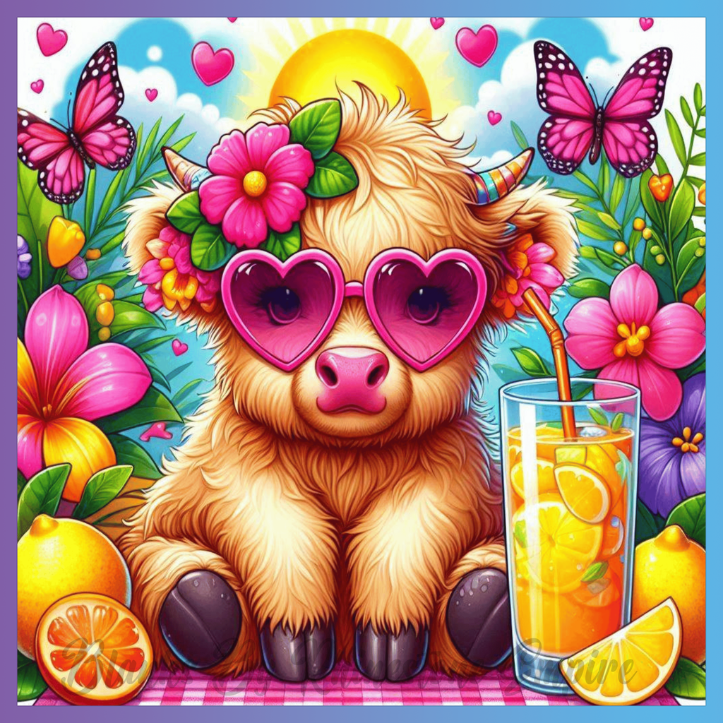 Theme: Cow with flowers, butterflies, sun, glasses.