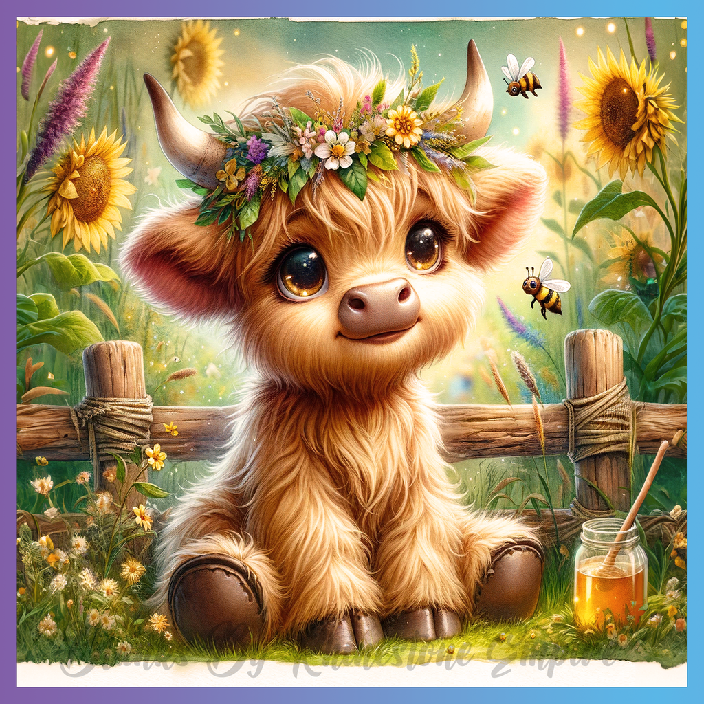 Theme: Calf with flowers, sunflowers, fence, bees.