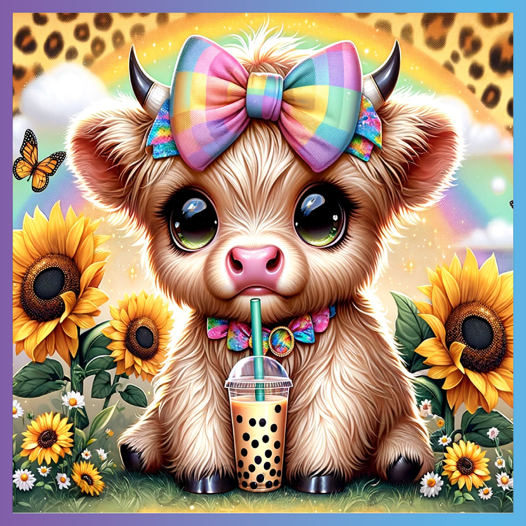 Theme: Calf with cute, sunflowers, bow, drink.