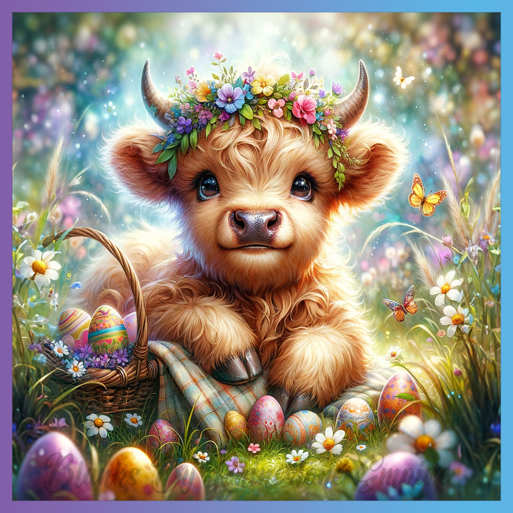 Theme: Calf with flowers, basket, easter eggs, butterflies.