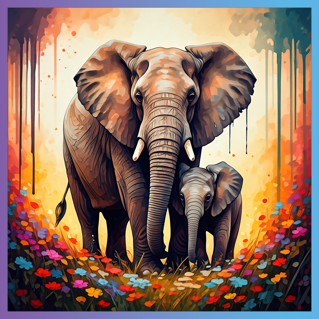 Theme: Elephant with mother, calf, flowers, colorful.