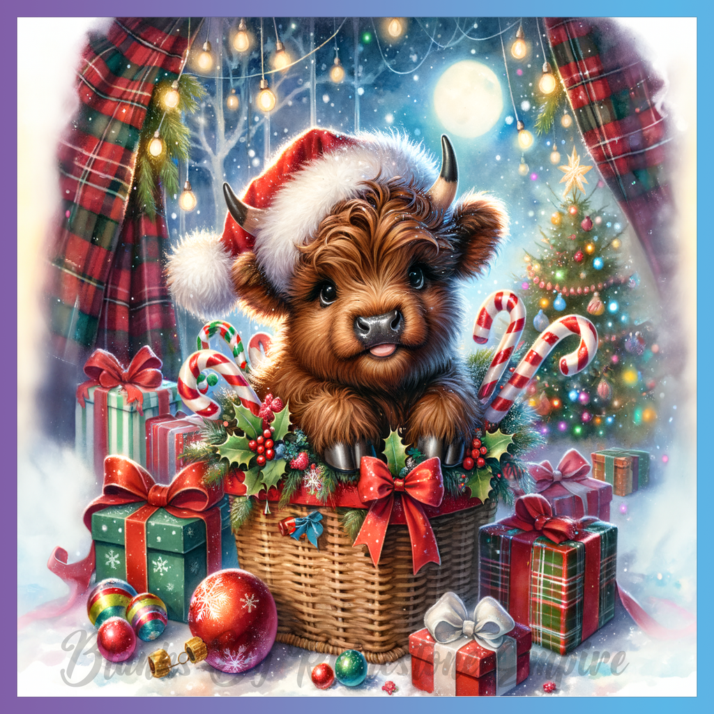 Theme: Buffalo with Christmas, hat, presents, candy canes.