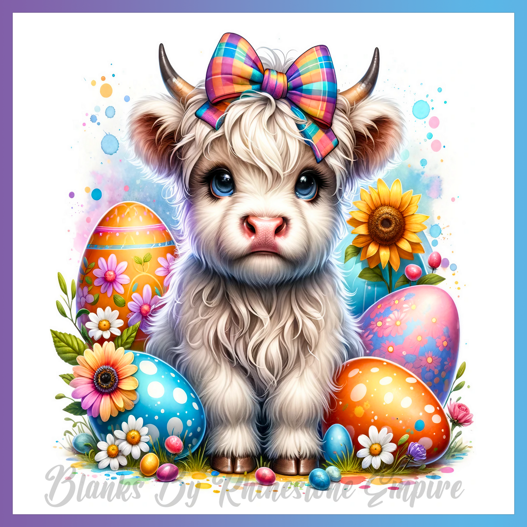 Theme: Calf with bow, Easter, eggs, flowers.